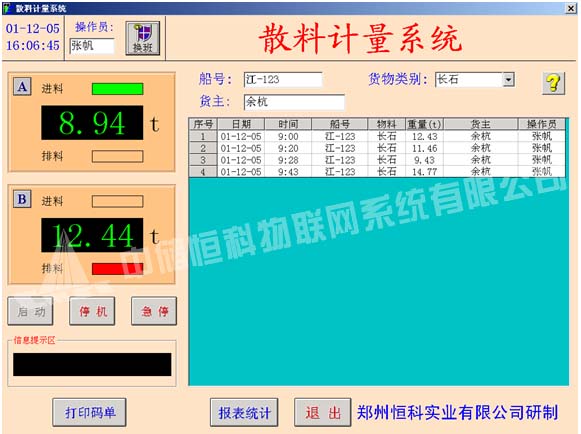 稱重控制儀表控制料斗A與料斗B交替進(jìn)料和排料,并將重量數(shù)據(jù)實(shí)時(shí)傳輸至工業(yè)控制計(jì)算機(jī),散料計(jì)量系統(tǒng)專用軟件自動(dòng)記錄每次排料重量,從而實(shí)現(xiàn)對(duì)物料的連續(xù)計(jì)量。系統(tǒng)也可由多臺(tái)稱重控制儀表分別控制多個(gè)料斗,與一臺(tái)工業(yè)控制計(jì)算機(jī)構(gòu)成。